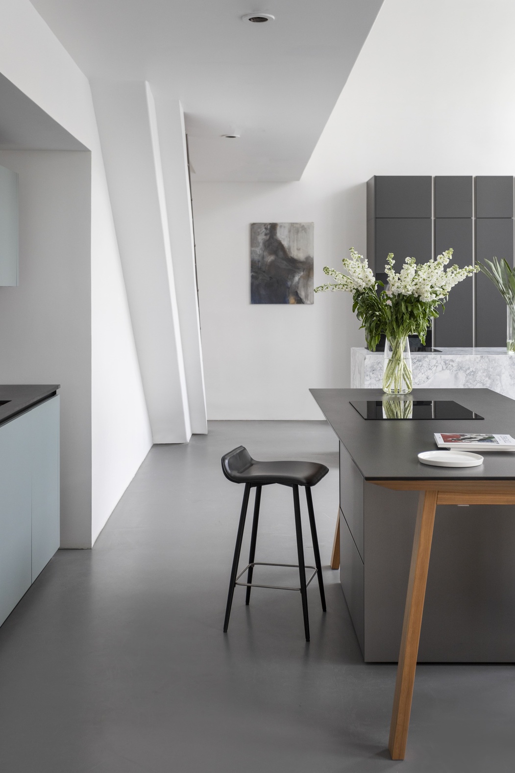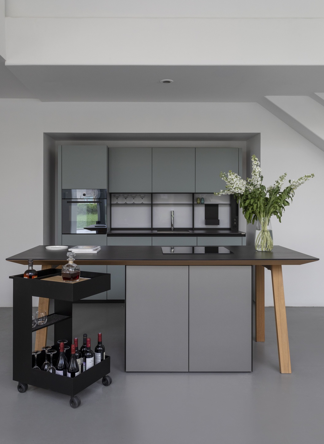 Немецкая кухня NEXT125 в матовом лаке с островом в стали. Столешница из суперпрочного испанского материала Dekton